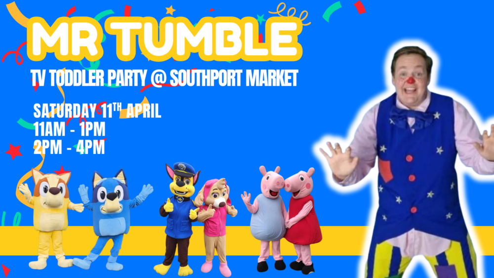 Tumbles Toddler TV Party, Southport Market (Saturday 11 April, 11am -1pm and 2pm – 4pm)