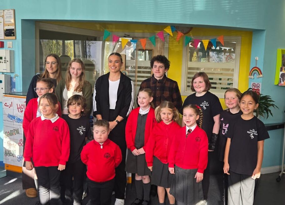 Gladiators star Jodie Ounsley met with local children and NSPCC staff in Liverpool to learn about how the charity supports children from the deaf community.