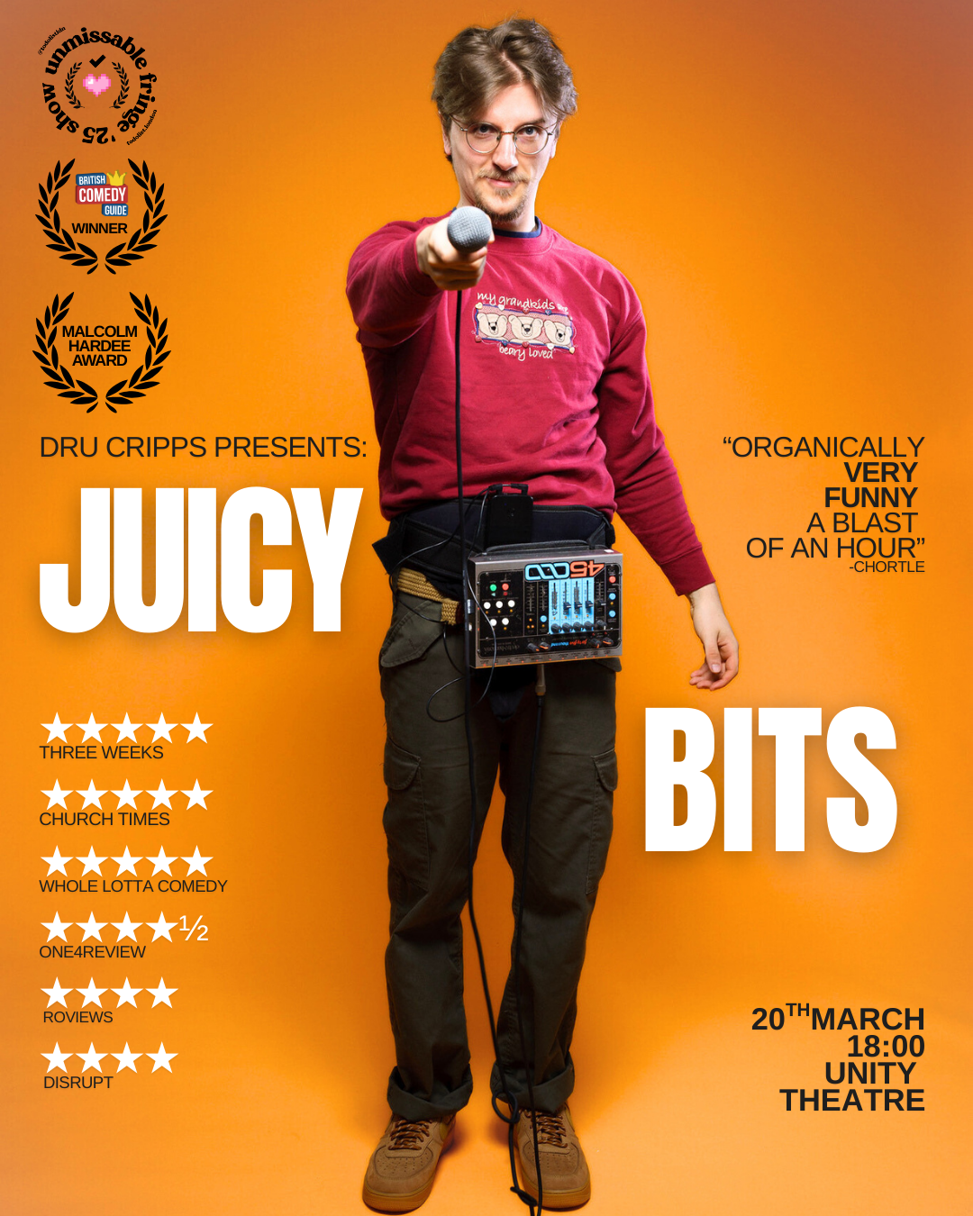 The following night – Friday 20th March – sees “Master Clown” Dru Cripps present his phenomenally successful loopstation-based shenanigans in Juicy Bits – a show so good it earned five 5-star reviews, sold out Edinburgh completely, and added extra dates. This quadruple award-winner (British Comedy Guide, Malcolm Hardee, Comedy Store King Gong, Solo FX Sponsorship) and BBC New Comedian of the Year nominee transforms audience suggestions into improvised songs, spontaneous musical sketches, and “utterly winning” chaos in real-time.